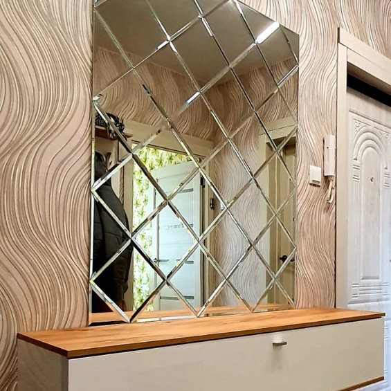 Использована зеркальная квадратная и треугольная плитка с фацетом.