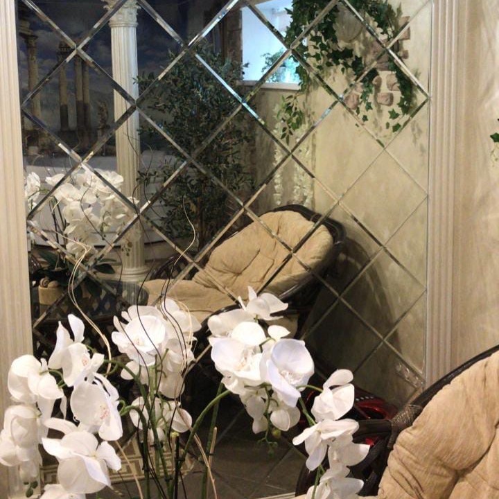 Использована зеркальная квадратная и треугольная плитка с фацетом.